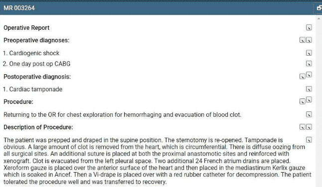 The patient had a post-operative complication (cardiac tamponade) following a previous CABG surgery, requiring a return to the operating room for exploration and evacuation of a blood clot. This is coded using CPT code 32658 (Exploration, mediastinum, with or without drainage; for postoperative hemorrhage, drainage of abscess, or to locate foreign body). Modifier 78 is appended to indicate an unplanned return to the operating room by the same physician following the initial procedure for a related procedure during the postoperative period.