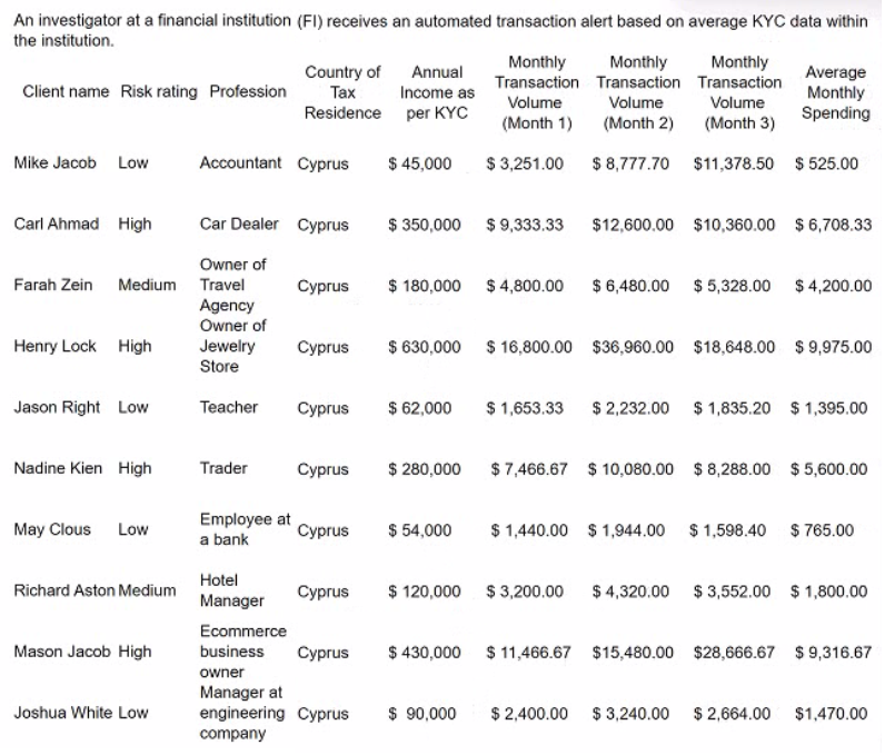 Each month the automated transaction monitoring system generates alerts based on predetermined scenarios. An alert was generated in relation to the account activity of ABC Foundation. Below is the transaction history for ABC Foundation (dates are in DD/MM/YYYY format).