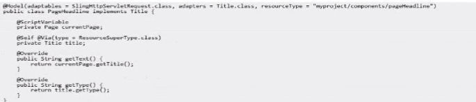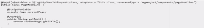 @Model Annotation: Specifies that this class is a Sling Model and adapts from SlingHttpServletRequest. It is also an adapter for Title.class and applies to the myproject/components/pageHeadline resource type.