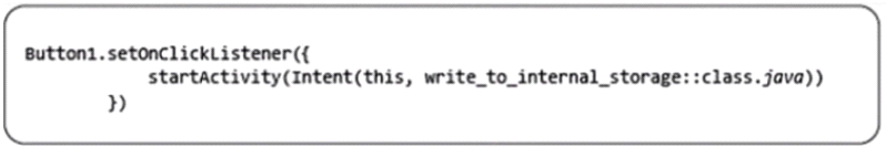What is the result of clicking Button1 in the code which is illustrated in the following image? Assuming that write_to_internal_storage is the name of an activity that allows users to write to internal storage.