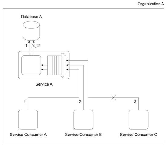 Organization A has been expanding and, as a result, is outgrowing the processing capacity of its on-premise Service A implementation. It is determined that this is due to usage thresholds of Service A and complex data processing limitations in Database A . The diagram depicts Organization A's current on-premise environment, where Service Consumers A . B and C attempt to access Service A at the same time. Service Consumer A successfully accesses Service A, which then successfully retrieves the requested data (1). Service Consumer B successfully accesses Service A, but due to the complex data structure, the request for the data times out and fails (2). Finally, Service Consumer C attempts to access Service A, but is rejected because Service A is unable to accept more concurrent requests.