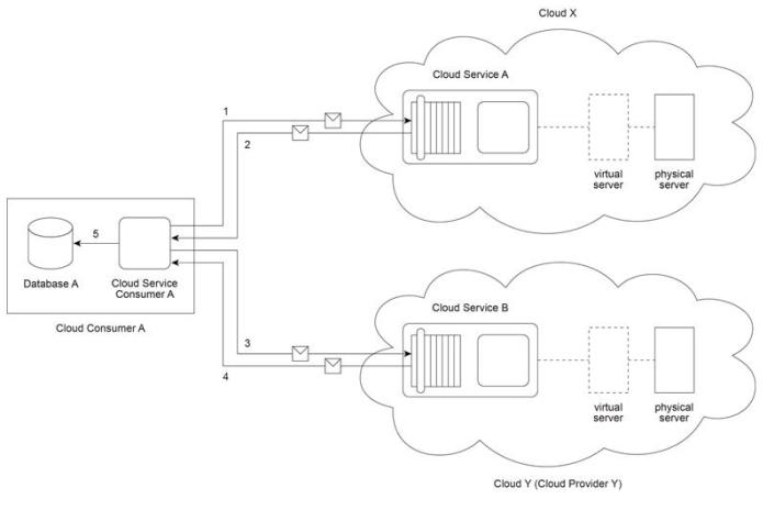 Cloud Service Consumer A invokes Cloud Service A from Cloud X (owned by Cloud Provider X) (1). To fulfill the request from Cloud Service Consumer A, Cloud Service A needs to invoke Cloud Service B that resides on Cloud Y (owned by Cloud Provider Y) (2). After completing its processing, Cloud Service B sends a response to Cloud Service A (3). Cloud Service A verifies the response and then finally sends its response to Cloud Service Consumer A (4).