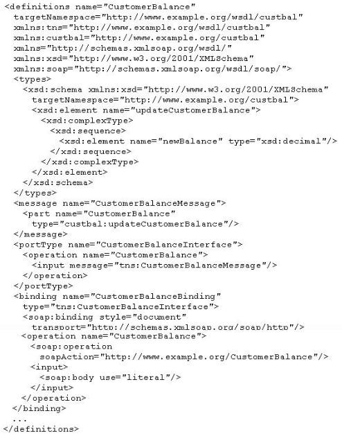 One of your developers was asked to build a Customer Balance service that is able to update a customer's outstanding account balance. Service consumers need to be able to send messages to the service with an element named "updateCustomerBalance" that contains a "newBalance" child element. You are presented with the following WSDL definition: