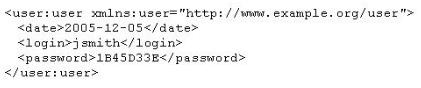 You are contacted by the IT department manager and told that from now on, all XML documents that are passed to and from services must have a namespace in order to more easily identify their related XML schema definitions. You revise the above sample document by adding a namespace declaration, as well as prefixes to the "user" element, as shown here: