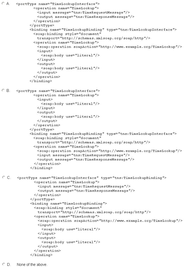 Your next task is to define the "portType" and "binding" elements. Which of the following fragments contain the correct "portType" and "binding" elements for this WSDL definition?