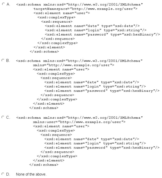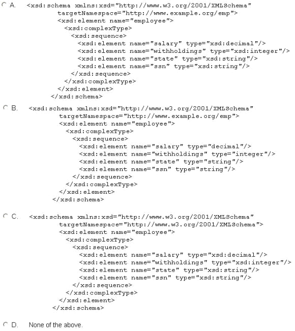 Your company's enterprise architecture team reviewed your schema to ensure that it conforms to internal design standards used for XML development. They have notified you that although your XML schema is technically correct, it must use the "xsd" prefix for the XML Schema namespace, rather than making it the default namespace. Which of the following revised XML schemas complies to this internal design standard while retaining its original meaning?