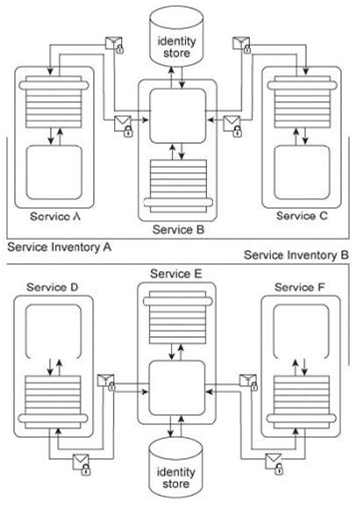 Services A, B, and C reside in Service Inventory A and Services D, E, and F reside in Service Inventory B .Service B is an authentication broker that issues WS-Trust based SAML tokens to Services A and C upon receiving security credentials from Services A and C .Service E is an authentication broker that issues WS-Trust based SAML tokens to Services D and F upon receiving security credentials from Services D and E .Service B uses the Service Inventory A identify store to validate the security credentials of Services A and C .Service E uses the Service Inventory B identity store to validate the security credentials of Services D and F .It is decided to use Service E as the sole authentication broker for all services in Service Inventories A and B .Service B is kept as a secondary authentication broker for load balancing purposes. Specifically, it is to be used for situations where authentication requests are expected to be extra time consuming in order to limit the performance burden on Service E .Even though Service B has all the necessary functionality to fulfill this new responsibility, only Service E can issue SAML tokens to other services. How can these architectures be modified to support these new requirements?