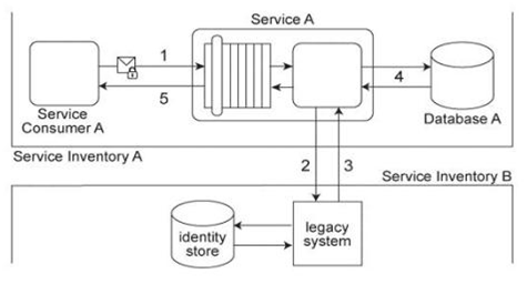 Service Consumer A submits a request message with security credentials to Service A (1). The identity store that Service A needs to use in order to authenticate the security credentials can only be accessed via a legacy system that resides in a different service inventory. Therefore, to authenticate Service Consumer A, Service A must first forward the security credentials to the legacy system (2). The legacy system then returns the requested identity to Service A (3). Service A authenticates Service Consumer A against the identity received from the legacy system. If the authentication is successful, Service A retrieves the requested data from Database A (4), and returns the data in a response message sent back to Service Consumer A (5). Service A belongs to Service Inventory A which further belongs to Security Domain A and the legacy system belongs to Service Inventory B which further belongs to Security Domain B .(The legacy system is encapsulated by other services within Service Inventory B, which are not shown in the diagram.) These two security domains trust each other. Communication between Service A and the legacy system is kept confidential using transport-layer security. No intermediary service agents currently exist between the two service inventories. However, it has been announced that due to the introduction of new systems, some intermediary service agents may be implemented in the near future. Additionally, the legacy system has been scheduled for retirement and will be replaced by a new identity management system that will provide a new identity store. Because the new identity store will need to serve many different systems, there are concerns that it could become a performance bottleneck. As a result, services (including Service A and other services in Security Domains A and B) will not be allowed to directly access the new identity store. Which of the following statements describes a solution that can accommodate the requirements of the new identity store, the authentication requirements of Service A, and can further ensure that message exchanges between Security Domains A and B remain confidential after intermediary service agents are introduced?