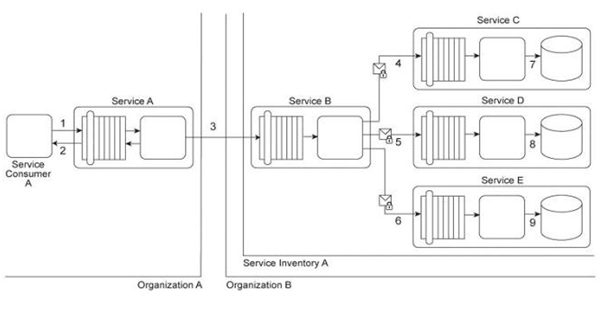 Service Consumer A sends a request to Service A (1). Service A replies with an acknowledgement message (2) and then processes the request and sends a request message to Service B (3). This message contains confidential financial data. Service B sends three different request messages together with its security credentials to Services C .D .and E (4, 5, 6). Upon successful authentication, Services C .D .and E store the data from the message in separate databases (7.8, 9). Services B .C .D, and E belong to Service Inventory A, which further belongs to Organization B .Service Consumer A and Service A belong to Organization A .Organization B decides to create a new service inventory (Service Inventory B) for services that handle confidential data. Access to these services is restricted by allocating Service Inventory B its own private network. Access to this private network is further restricted by a dedicated firewall. Services C, D and E are moved into Service Inventory B, and as a result. Service B can no longer directly access these services. How can this architecture be changed to allow Service B to access Services C, D and E in a manner that does not jeopardize the security of Service Inventory B while also having a minimal impact on the service composition's performance?