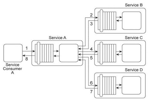 Service Consumer A sends a request message to Service A (1) after which Service A retrieves financial data from Database A (2). Service A then sends a request message with the retrieved data to Service B (3). Service B exchanges messages with Service C (4) and Service D (5), which perform a series of calculations on the data and return the results to Service A .Service A uses these results to update Database A (7) and finally sends a response message to Service Consumer A (8). Component B has direct, independent access to Database A and is fully trusted by Database A .Both Component B and Database A reside within Organization A .Service Consumer A and Services A, B, C, and D are external to the organizational boundary of Organization A .