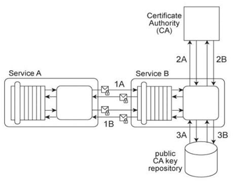 Service A exchanges messages with Service B multiple times during the same runtime service activity. Communication between Services A and B has been secured using transport-layer security. With each service request message sent to Service B (1A .IB), Service A includes an X.509 certificate, signed by an external Certificate Authority (CA). Service B validates the certificate by retrieving the public key of the CA (2A .2B) and verifying the digital signature of the X.509 certificate. Service B then performs a certificate revocation check against a separate external CA repository (3A, 3B). No intermediary service agents reside between Service A and Service B .Service B has recently suffered from poor runtime performance plus it has been the victim of an access-oriented attack. As a result, its security architecture must be changed to fulfill the following new requirements: