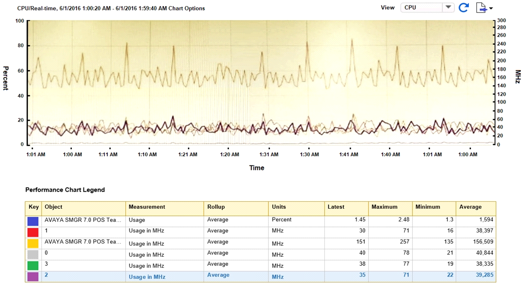 Why is the usage measurement of CPU2 (in Purple) shown in the chart highlighted in the table?