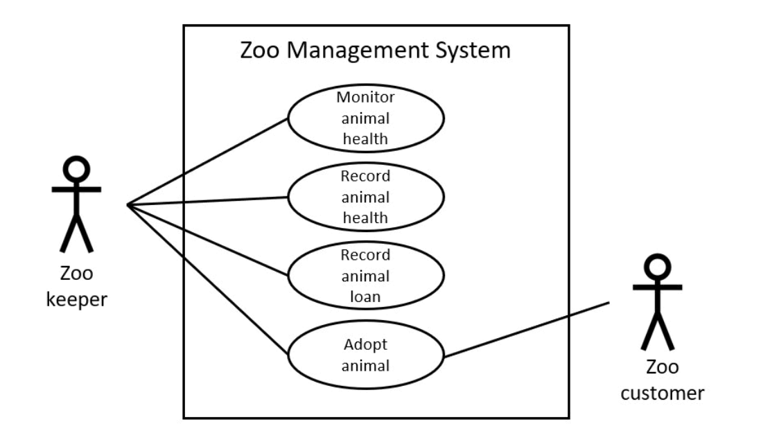 A business analyst has constructed a use case diagram for the zoo: