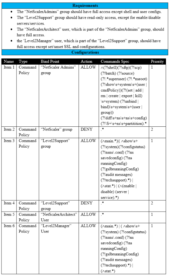 Scenario: A Citrix Architect needs to assess an existing NetScaler configuration. The customer recently found that members of certain administrator groups were receiving permissions on the production NetScaler appliances that do NOT align with the designed security requirements.