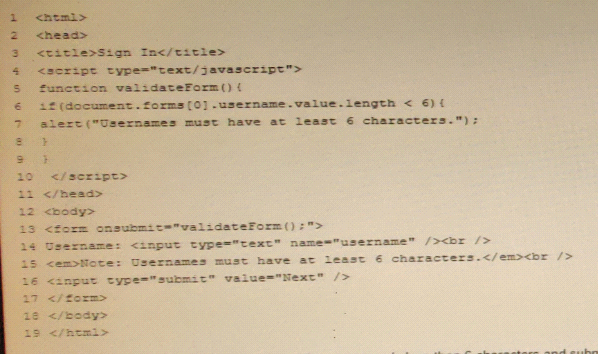 The code displays a pop-up alert message if the username is less than 6 characters and submits the form. What change should be made to prevent the form from submitted if the username is less than 6 characters?