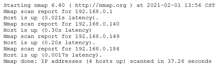 nmap -sn 192.168.0.1-254: This part uses nmap, a network scanning tool, to perform a ping scan (-sn) on the IP range 192.168.0.1-254, which means sending ICMP echo requests to each IP address and checking if they respond.