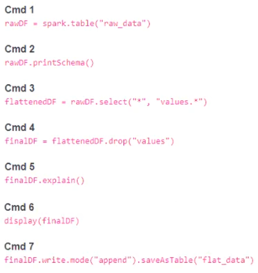 Cmd 3: Selects all the columns from the rawDF dataframe, as well as the nested columns from the values struct column, and creates a new dataframe called flattenedDF.