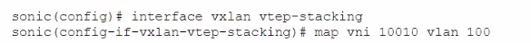 The command interface vxlan vtep-stacking followed by map vni 10010 vlan 100 maps the VLAN traffic that an SVLAN identifies to a VNI on a VTEP. In this context, SVLAN (Service VLAN) is being mapped to a VXLAN Network Identifier (VNI) for encapsulation and transport across the VXLAN tunnel.