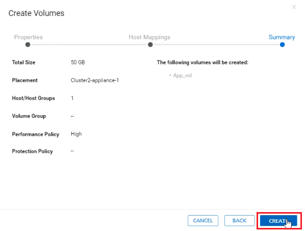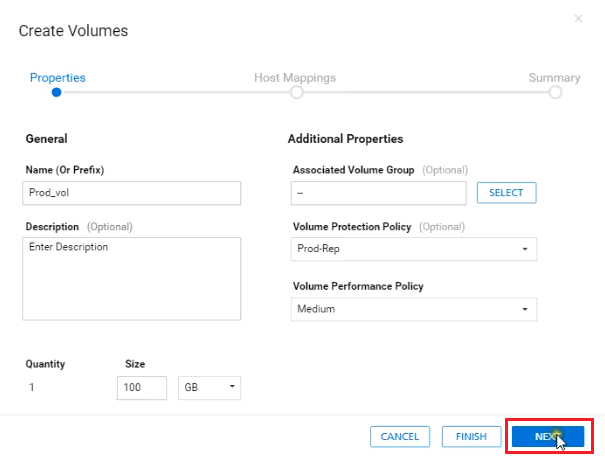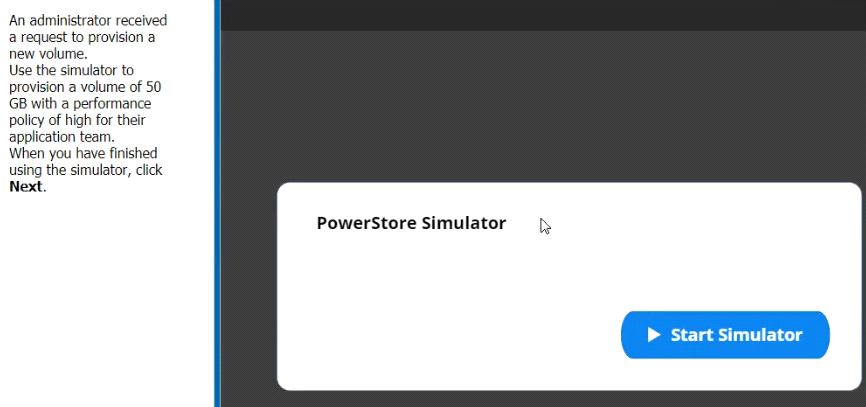 An administrator received a request to provision a new volume. Use the simulator to provision a volume of 50 GB with a performance policy of high for their host named "ApplicationTeam". When you have finished using the simulator, click Next.