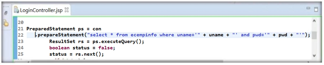 During his secure code review, John, an independent application security expert, found that the developer has used Java code as highlighted in the following screenshot. Identify the security mistake committed by the developer?