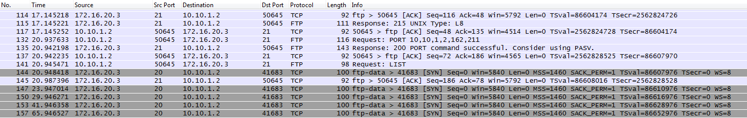 An LTM Specialist is investigating reports that users are unable to perform some commands through an FTP virtual server. The LTM Specialist performs a capture on the server side of the LTM device.