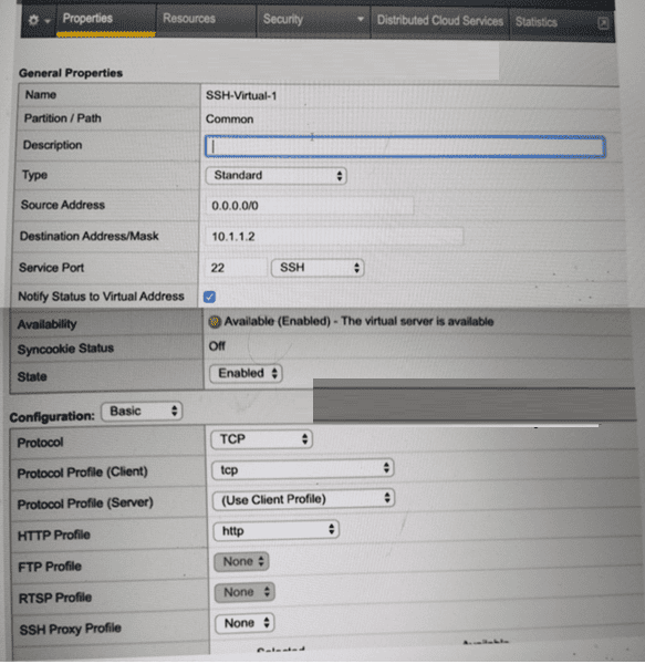 SSH is a Layer 4 TCP-based protocol that operates on TCP port 22 and does not use HTTP in any capacity. In the exhibit, the Virtual Server is configured with an HTTP Profile applied, which is inappropriate for SSH traffic and causes connection failures.