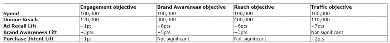 A medium-sized travel business executes a digital strategy with a focus on building brand awareness for its new travel package. The advertiser runs a 4-cell Brand Lift test comparing the Engagement objective against other objectives. Assume the following results:
