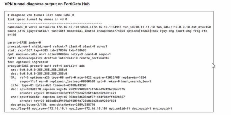 The diagnostic output shows the VPN configuration details, but it is important to check the quick mode selectors to ensure that the necessary subnets are included.