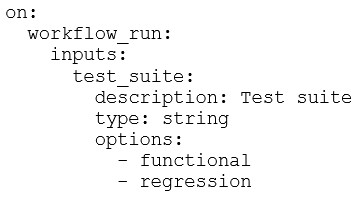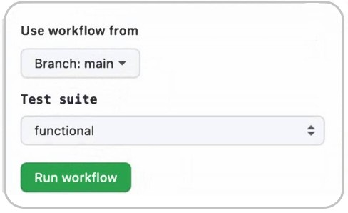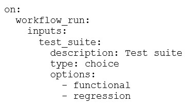 The first image shows a workflow trigger with an option for the test suite, and the chosen YAML configuration matches this interface. Specifically, the test suite input is defined with type: choice and includes the option value: functional, which aligns with the visible UI elements in the first image.