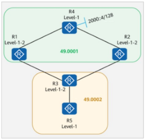 In the figure, R1 and R2 are configured as Level-1-2 routers, R3 is a Level-1-2 router, R4 is a Level-1 router, and R5 is a Level-1 router. The area borders are indicated by the system IDs (49.0001 for R4's area and 49.0002 for R3 and R5's area).