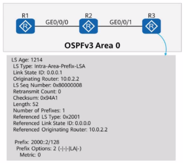 On the OSPFv3 network shown in the figure, OSPFv3 is enabled on the interfaces connecting R1, R2, and R3. The router ID of each router is 10.0.X.X, where X is the number of the router. If you check detailed information about an LSA on R3, the command output shows that the LSA is generated by R2 and describes the IPv6 prefix address associated with the Router-LSA.