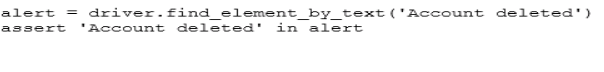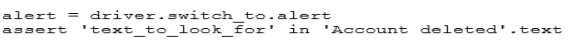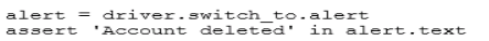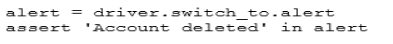 The line of code to allow you to know that the 'Account deleted' alert is displayed is: alert = driver.switch_to.alert assert 'Account deleted' in alert.text