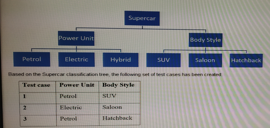 Supercar is an online vehicle sales website specializing in a single manufacturer's Sports Utility Vehicles (SUVs) and saloons A vehicle has two key elements, power unit and body style The manufacturer offers three choices of power unit: petrol, electric and hybrid There are 3 main body styles Saloon, Hatchback and SUV. SUVs are available only as petrol and electric options. Hybrid is available for Hatchback only The website will allow an order to be processed if the chosen vehicle configuration is in stock, otherwise a message will be displayed asking the user to Cry again later. Based on the specification, the following classification tree has been developed: