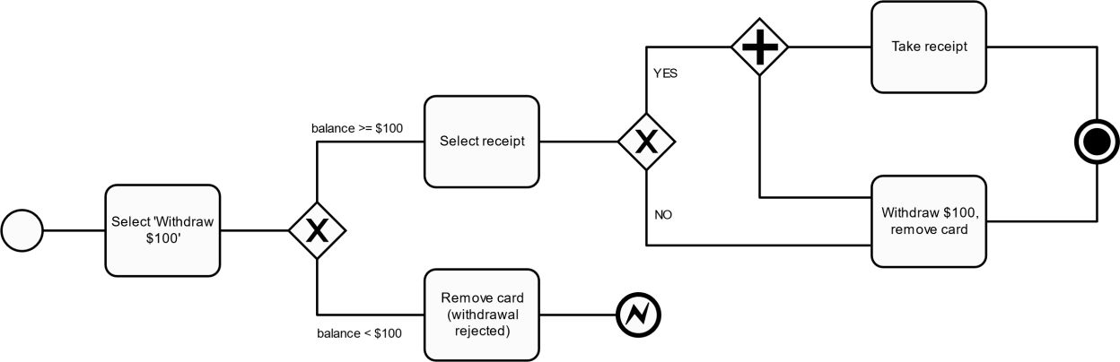 As an acceptance tester you want to test the $100 withdrawal process described by the following Business Process Model and Notation (BPMN) model.