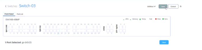 In the Juniper Mist AI for Wired dashboard, administrators can select one or more switch ports (as shown in the exhibit, e.g., port ge-0/0/25 on an EX4100-48MP). Once configuration changes are made --- such as VLAN assignment, port profiles, PoE settings, or administrative state --- the Save button must be clicked to confirm and apply those changes to the device.