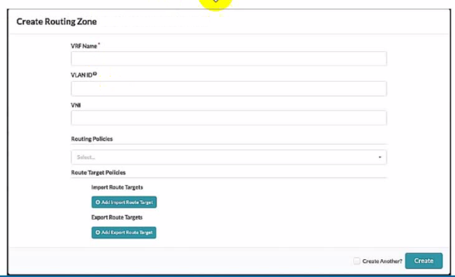 To create a new routing zone, you must specify the VRF Name, VLAN ID, and VNI for the routing zone. These are the mandatory fields in the user interface shown in the exhibit. The VRF Name is the name of the L3 domain that isolates the IP traffic of the routing zone from other routing zones. The VLAN ID is the identifier for the VLAN tagged Layer 3 links on external connections. The VNI is the VxLAN Network Identifier associated with the routing zone. The Routing Policies are optional fields that allow you to configure import and export route targets for the routing zone. These are only applicable for EVPN routing zones, which use MP-EBGP as the overlay control protocol. The other options are incorrect because: