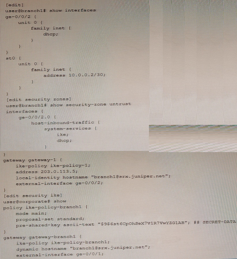 You are trying to configure an IPsec tunnel between SRX Series devices in the corporate office and branch1. You have committed the configuration shown in the exhibit, but the IPsec tunnel is not establishing.