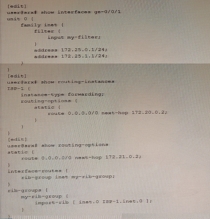 You are implementing filter-based forwarding to send traffic from the 172.25.0.0/24 network through ISP-1 while sending all other traffic through your connection to ISP-2. Your ge-0/0/1 interface connects to two networks, including the 172.25.0.0/24 network. You have implemented the configuration shown in the exhibit. The traffic from the 172.25.0.0/24 network is being forwarded as expected to 172.20.0.2, however traffic from the other network (172.25.1.0/24) is not being forwarded to the upstream 172.21.0.2 neighbor.