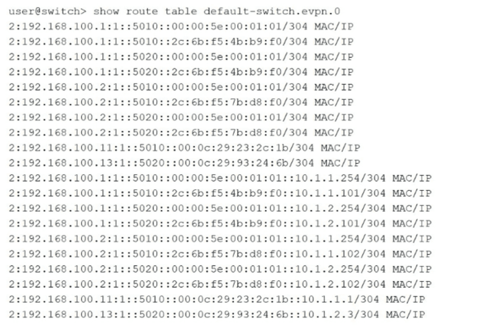 For example, the prefix 2:192.168.100.1:1::5010::... indicates an EVPN Type 2 route (2:) where 192.168.100.1:1 is the Route Distinguisher.