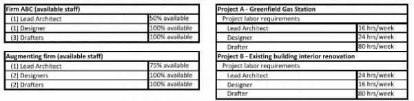 Design Firm ABC is awarded two projects, but they do not have enough staff to support the execution of both projects due to unexpected staffing issues. ABC is deciding if they need to hire staff from an outside firm to execute the projects.