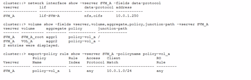 A Linux host with the 10.0.1.24 IP address is unable to mount the VOL_A volume using NFSv3.