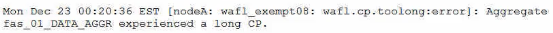 A disk failing or being failed is not a likely cause for a long CP, because the system will automatically mark the disk as failed and remove it from the aggregate.The system will also initiate a disk reconstruction or a RAID scrub to restore the data protection and redundancy4
