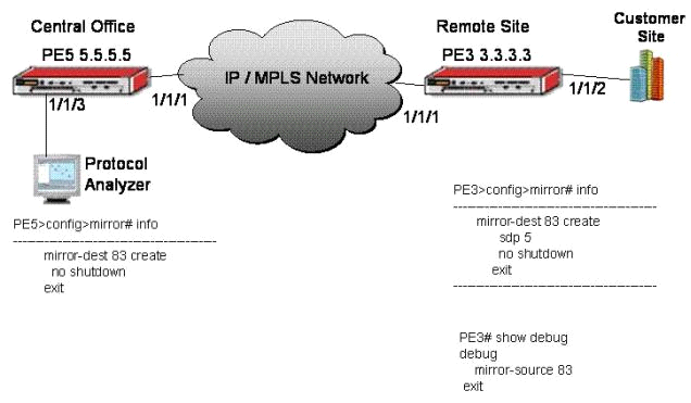 Assuming the customer only needs to monitor traffic from PE3 to the customer site, what two items are missing in the configuration of PE5, the Alcatel-Lucent 7750 Service Router in the Head Office? (Assume that the IP/MPLS network structure between the local and remote PEs is in place.)
