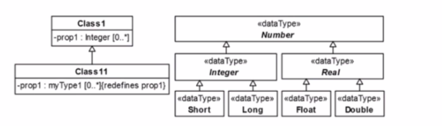 In the given diagram, myType1 is shown redefining prop1, which was originally of type Integer. Given that Integer is a subtype of Number, and myType1 is used in a redefinition context, it implies that myType1 must also be a subtype of Number. In UML, when a property is redefined, the redefining property must be type compatible with the property it redefines. Therefore, myType1 could be substituted by any subtype of Number, which includes Integer, Real, and all their subtypes (Short, Long, Float, Double, etc.). This is based on the UML principle of type conformance in property redefinition, as specified in the UML 2.x Superstructure Specification.
