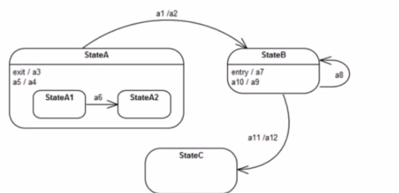 Assuming the system is in StateA1, the behaviors (or actions) executed when moving to StateC would begin with any behaviors associated with internal transitions or exit actions within StateA1. Transition a6 would be the trigger to go from StateA1 to StateA2, executing a4 (the exit action of StateA1) before the transition. Upon exiting StateA altogether (a3 is the exit action for StateA), the system would follow the transition labeled a1 to StateB, executing a7 as the entry action of StateB. Then, the transition from StateB to StateC would occur, likely with an internal trigger within StateB or by completion, followed by a11 to complete the transition into StateC. The actions follow the flow of state transitions and the associated entry and exit actions as prescribed by UML state machine behavior specifications.
