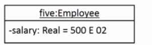 E) -salary: Real = 500 E 02 - This is scientific notation, which is also a valid representation of real numbers in UML. The value represented here is 500 * 10^2, which equals 50,000.00.