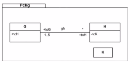 The diagram you provided shows two classes, G and H, which are within a package named Pckg. Each class has an attribute named 'v' with different visibility and type indicators. The attribute 'v' in class G has visibility 'private' (denoted by '-'), and in class H, it is 'protected' (denoted by '#'). This suggests that the scope of each 'v' is limited to its respective class. Therefore, when you refer to 'v' within the package, its meaning depends on the context or the namespace from which it's accessed.