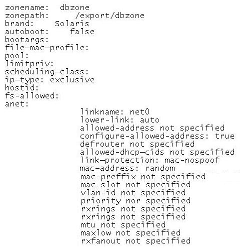 You have completed configuring a zone named dbzone on your Solaris 11 server. The configuration is as following:
