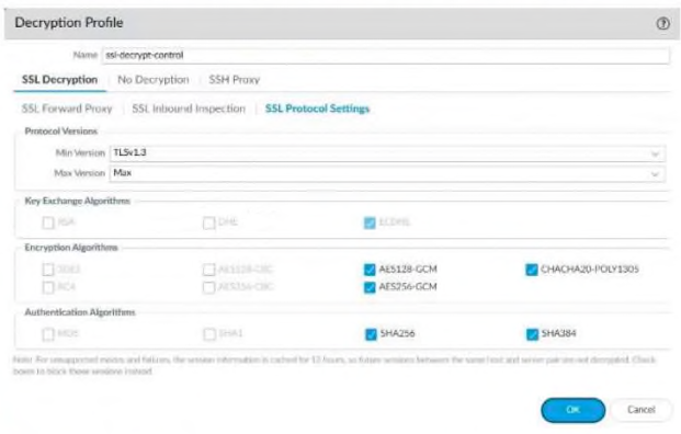 In the provided image, the Decryption Profile is configured with a Min Version of TLSv1.3. While this represents a high security posture, it introduces a significant operational risk: compatibility issues with legacy applications or clients.