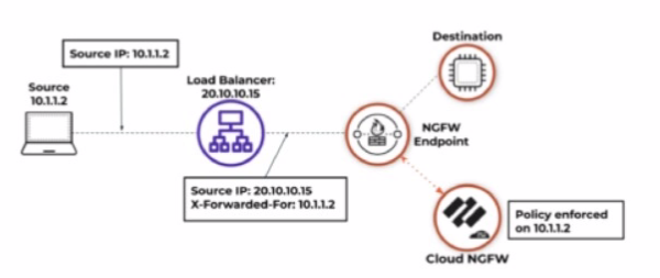 Logging Mechanism: Unless explicitly configured to parse the 'X-Forwarded-For' header, the firewall's logs will reflect the IP address of the device directly sending the traffic to the NGFW (the load balancer in this case).